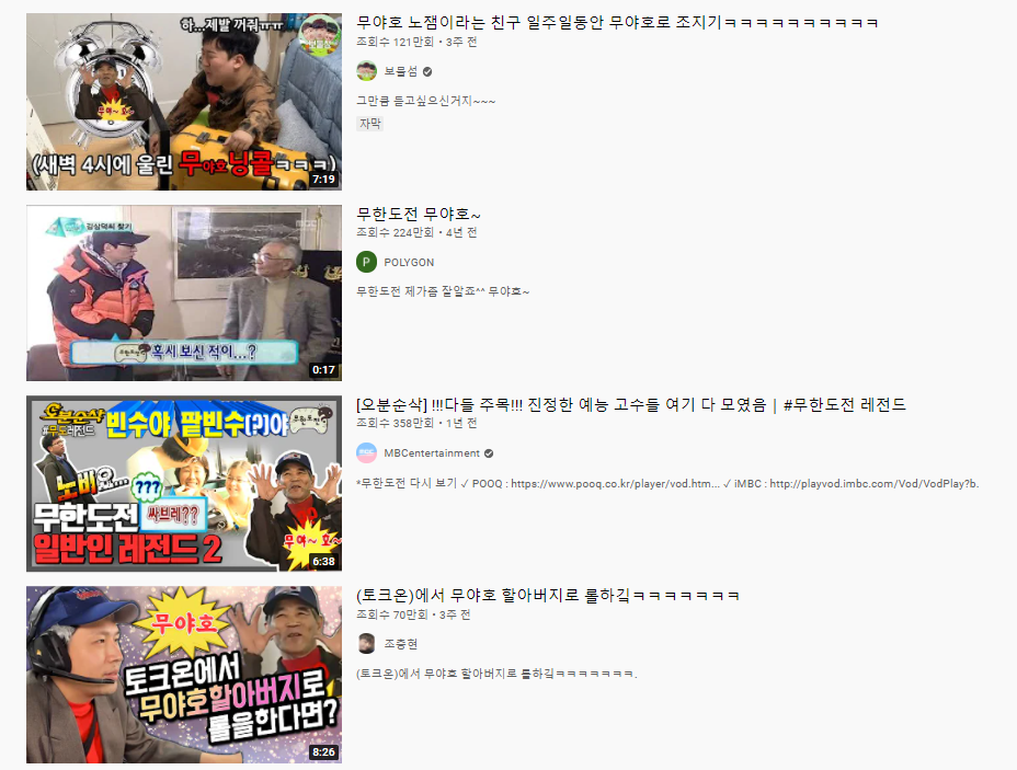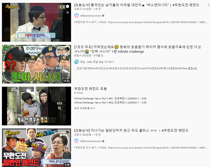 무한도전이 10년이 넘는 긴 시간동안 국민예능으로 사랑받은 만큼 오늘날까지도 무한도전의 레전드 영상들이 편집되어 인기를 누리고 있습니다.