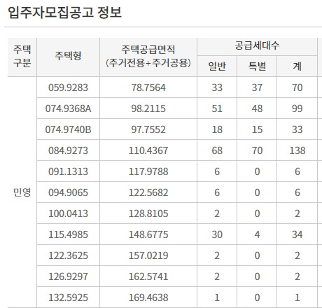 청약홈의 입주자모집공고 정보를 보면 주택형과 주택공급면적을 확인할 수 있습니다. 주택형 84타입의 공급면적은 110.4m2라고 나옵니다. 여기서 주택형이란 전용면적을 의미합니다.